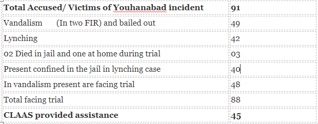 Current situation of Youhanabad case: Up-date Of Vandalism case There are three trials (one trial in lynching case and two trials in vandalism case) regarding Youhanabad twin Churches Blast are under proceedings since 2015 and pending before the court of Mr. Sajjad Ahmed Judge Anti-Terrorism Court Lahore. In all three trials 91 accused were booked by the police. Three died while were facing trial and the remaining 88(presently 40 accused in lynching case are confined in Kot Lakhpat Jail Lahore and 48 in vandalism case is on bail) are facing trial in Anti- Terrorism court Lahore. On August 26th, 2019 in FIR No. 395/15 titled as State vs Samson etc was fixed before Anti-Terrorism Court Lahore and CLAAS legal adviser Mr. Tahir Bashir Advocate was present in the court on behalf of seven accused. The remaining accused of this case were also present but their lawyer was absent. Since the trails of three Youhanabad cases are commenced CLAAS lawyer is appearing regularly in every date of hearing in the Anti-Terrorism Court Lahore. While sharing with Mr. Tahir Bashir Advocate, 14 accused disclosed that their lawyer is not appearing from last more than one year and now they are feeling helpless. The said accused further put their confidence upon work of CLAAS, requested for pursuing their case and 14 accused signed power of attorney of CLAAS lawyer which was submitted in the court on the same date. Now CLAAS is representing all accused (21 who are nominated in vandalism FIR 395/15) and is pursuing the case in trial court as the case was delayed due to non-availability of other lawyers who are pursuing the case. So, at present out of 88 accused CLAAS is providing legal assistance to 45 accused (39 in vandalism and 06 in lynching case) in trial court. CLAAS lawyer has completed cross examination on prosecution witnesses and has also advanced arguments in above said trials.