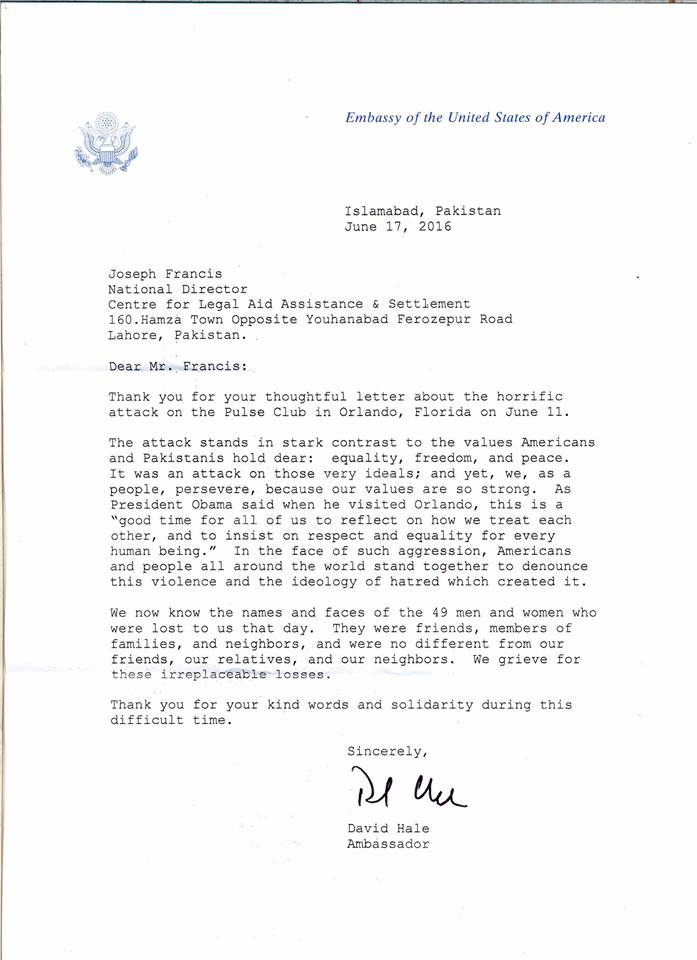 Letter of David Hale American Ambassador, to Mr. M.A Joseph Francis in response condolence of Orlando shooting.